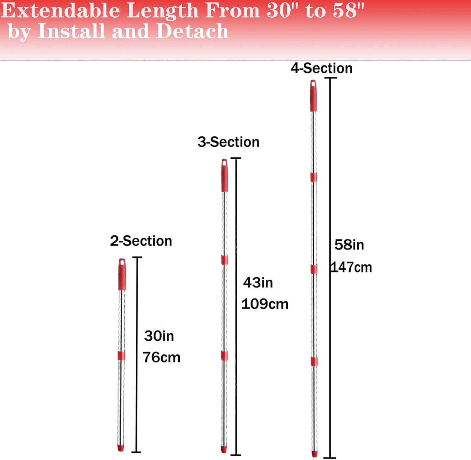 - 【Easy to install】 The mop poles are rotated to install and tighten. Very easy to assemble. It comes in 4 sections and can be adjusted from 30in to 58in. You can combine it into different sizes according to your height, usage habits, and scenarios. You can combine it into different sizes according to your height, usage habits, and scenarios.