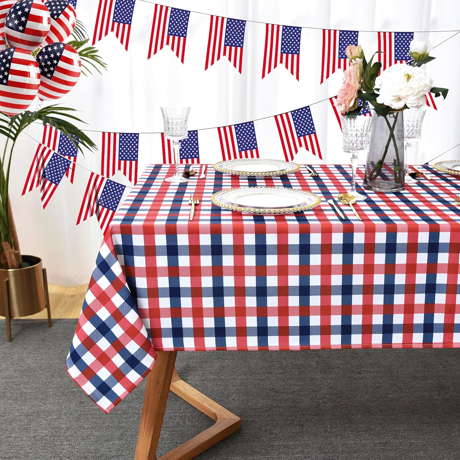 Waterproof Plaid Tablecloth Fabric - Oblong 52x70 Inch Patriotic Party Table Cloth for Indoor/Outdoor Use - Independence Day Memorial Day Washable Table Cover