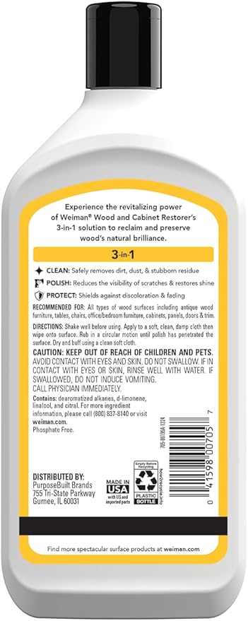 - REJUVENATE YOUR WOOD SURFACES: Bring new life to your natural wood furniture and cabinets with the Weiman Wood and Cabinet Restorer 3-In-1 Bundle that comes with a microfiber cloth. This bundle was specifically designed for all type of wood surfaces like antique wood, tables, chairs, desk, bedroom sets, wood cabinets, wood panels, wood doors, trim, office furniture, and bedroom furniture.